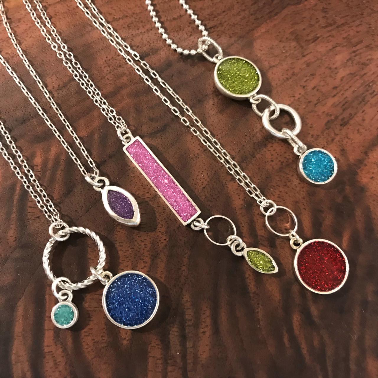 Local favorite jewelry maker, Karen Trimble-Shell, has introduced this new line of designs that captures brilliant & bold, fun & poppy modern colors and simple lines with custom blended colored resins, finely set in silver. Perfect for some summer sizzle.